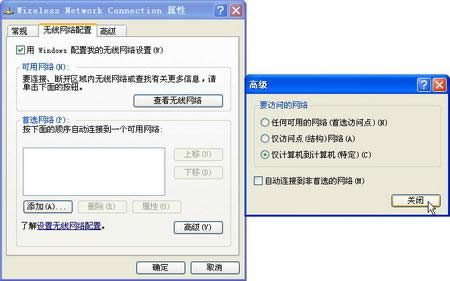 1、打开无线连接属性,切换到无线网络配置,打开下面的高级,我们选择“仅计算机到计算机(特定)即可,然后关闭确定。