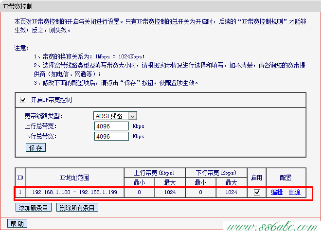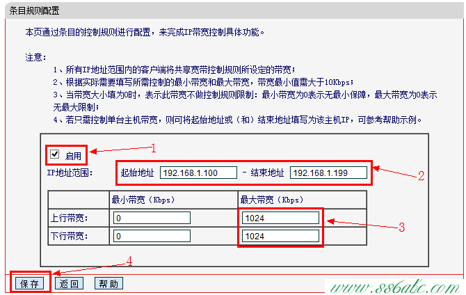 4、勾选“启用”---->在“起始地址”和“结束地址”选项后面填写第二部中记录下来的“DHCP服务”下的“地址池开始地址”和“地址池结束地址”---->在“最大宽带”列下面设置“上行宽带”和“下行宽带”(其实就是上传数据和下载数据是允许使用的最大宽带)填写1024(假设限制局域网中的计算机允许多大使用1M宽带,用户请根据自己的需要进行设置)---->点击“保存”