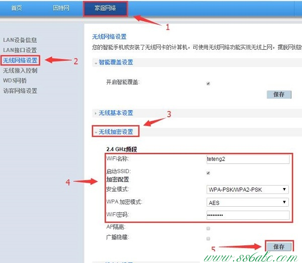 设置登录到主路由器A的设置界面,点击“家庭网络”——>“无线网络设置”——>“无线加密设置”——>设置“Wi-Fi名称”——>“安全模式”选择:WPA-PSK/WPA2-PSK——>“WPA加密模式”选择:AES——>“Wi-Fi密码”——>点击“保存”。