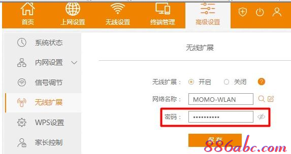 4、然后在“密码”选项中,输入被桥接无线信号的密码——>点击“保存”。