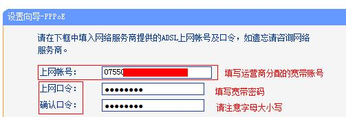 (5)、配置宽带帐号和密码:输入宽带运营商提供的宽带帐号和密码——>点击“下一步”。