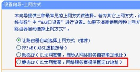 如果你的宽带与上面描述相符,上网方式就应该选择:“静态IP”——>点击“下一步”。
