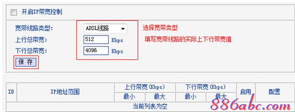在TL-WR882N路由器的设置界面,点击“IP宽带控制”——>“宽带线路类型”选择:ADSL线路——>“上行总宽带”填写:512Kbps——>“下行总宽带”填写:4096Kbps——>“保存”。