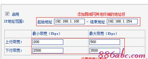 再次点击“添加新条目”——>起始地址”填写:192.168.1.100——>“结束地址”填写:192.168.1.254——>“上行带宽最小带宽”为 200——>“上行最大带宽”为 500——>设置“下行最小宽带”为 2500——>“最大下行带宽”为 3500——>点击“保存”。
