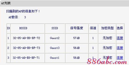 4、在扫描结果中,找到主路由器的无线信号名称(SSID)——>点击“连接”。连接后需要设置-无线密钥:“密钥类型”请选择与主路由器的类型一致——>“密钥”请输入主路由器的无线网络密码——>点击“下一步”。