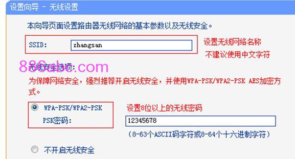 5、设置无线网络:设置“SSID”,SSID就是无线网络名称,建议用数字和字母的组合,不要使用中文汉字——>选择“WPA-PSK/WPA2-PSK”——>设置“PSK密码”——>点击“下一步”。