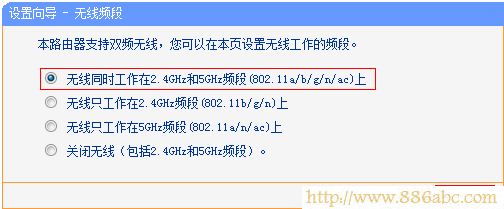 6、设置无线工作频段:选择“无线同时工作在2.4GHz和5GHz频段(802.11a/b/g/n/ac)上”——>点击“下一步”。