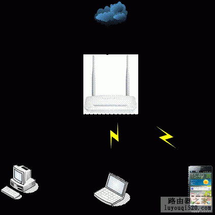 说明:无线路由器相当于一台有线路由器加一个无线发射的小型“基站”,可以同时满足有线电脑、无线的笔记本、手机等终端同时接入共享宽带上网。