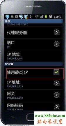 STEP2:手机默认“使用静态IP”的勾没有勾上,即自动获取IP地址(推荐)。获取到正确的网络参数之后,手机即可正常连接到网络。如果要手动设置静态IP,可以将“使用静态IP”勾选上,并手动设置“IP地址”、“网关”、“网络掩码”以及“DNS”等参数。