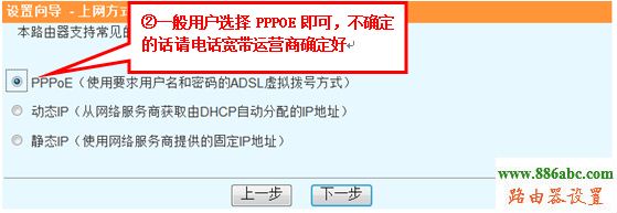 此步注意:(1)传统带猫的ADSL宽带,选第一个PPPOE模式,即电信,长宽,艾普...