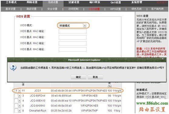 1. 进入路由器的管理界面——高级设置——无线设置——WDS设置——WDS模式(桥接模式) 点扫描,搜索到前面主路由器的SSID,选择1,如果提示更改频道,点确定。查看对应主路由器的MAC是否已经填入到WDS基点MAC地址里面,点应用保存设置。
